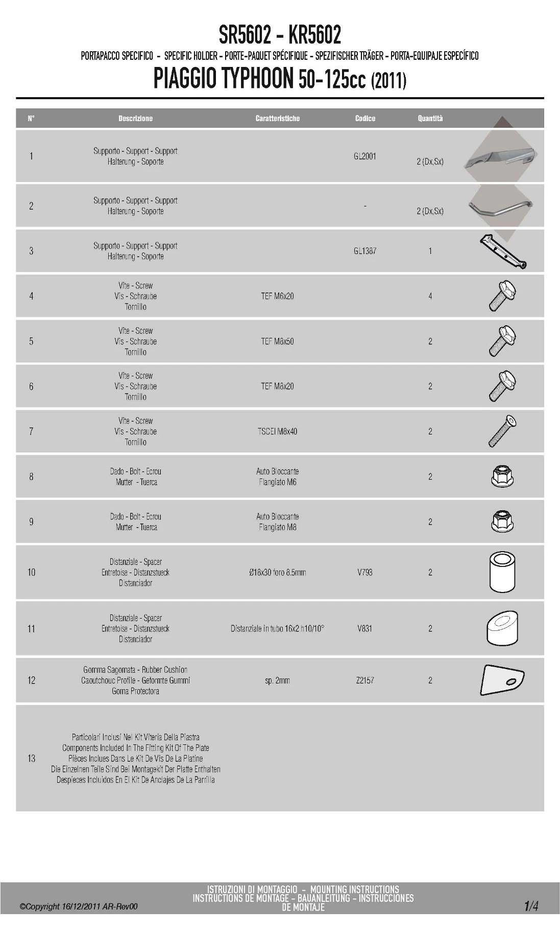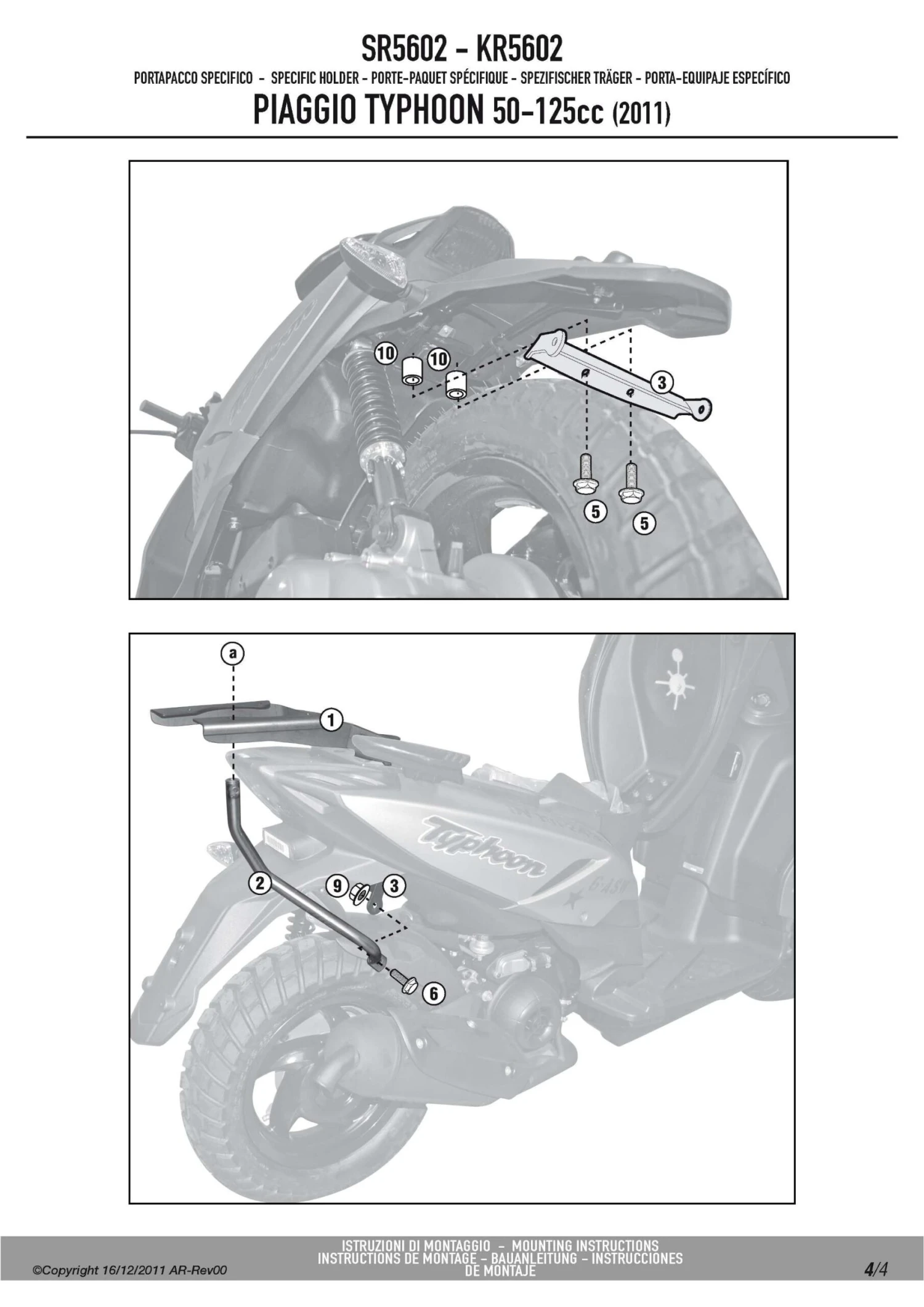 GIVI’s SR5602 Specific Rack is made specifically for Piaggio Typhoon 50-125 (2011-current).This rack will take GIVI Monolock top boxes only. The rack is srong, functional, and well-tested. All parts needed to mount the Givi SR5602 rack are included. Installs quickly using simple hand tools. No welding or cutting of existing frame or body parts required, The GIVI SR5602 rack does not include a Monolock base plate, use the universal Monolock base plate which comes with the Monolock top box of your choice. Please note: maximum load allowed 3Kg.