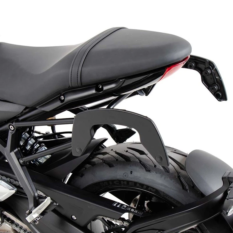 The C-Bow System consists of a very discrete C-shaped mounting plate that accepts the Street soft bags and applicable Leather bags. When the bags are off of the bike, the C-Bow holder is unobtrusive to the appearance of the bike. This allows you to leave the mounting plate on your bike without taking away from the look of the bike. To attach the bags, all you have to do is slide them onto the C-shaped mount. All C-Bow bags come with a lock and key to secure them to the C-Bow mount.