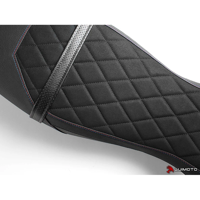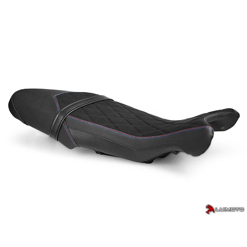 Luimoto’s 8253101 Motorsports Diamond Seat Cover Rider, Suede Black/Prodigy Black/Red Blue Stitch/Perforated Black is made specifically for BMW R Ninet Scrambler, Urban G/S (2016-current).