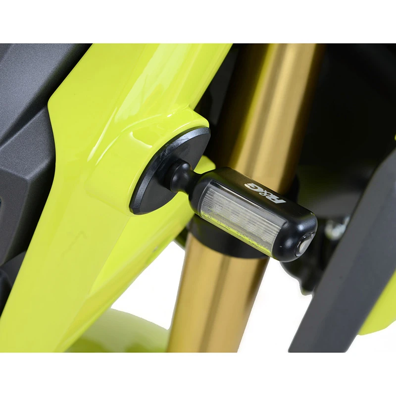 Durable plastic construction is lightweight and precision cut to fit the fairing perfectly. These handy adapters allow you to lose the bulky factory equipment and upgrade to the sleek R&G Micro LED indicators. Mounting to the bodywork is simple and does not require any modifications. When upgrading the turn signals on your Grom, make sure you order a set of R&G indicator adapters for the cleanest possible look!