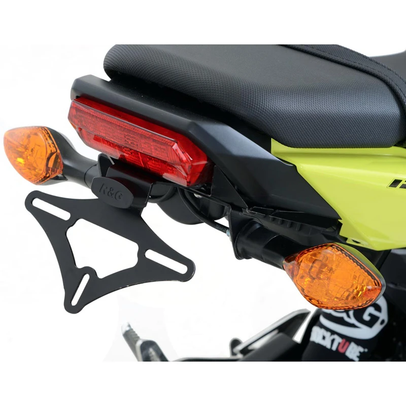 The factory tag holder on the Honda Grom MXS125 is large, bulky and extends way over your rear tire, so replace it with the sleeker, sportier looking R&G “Tail Tidy” fender eliminator. This replacement license plate holder is compatible with your factory signals, comes with a LED number plate light and cleans up the back end of your motorcycle. R&G manufactures the ingeniously designed “Tail Tidy” using stainless steel and adds a black powder coat for a super durable finish. Made specifically for your motorcycle, includes all mounting hardware and installation instructions the R&G “Tail Tidy” fender eliminator provides you with a high-quality and sturdy substitution for the uninspiring original.